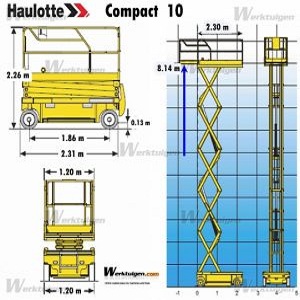 Thông tin sản phẩm COMPACT10 Chiều cao làm việc 10.15 m Chiều cao sàn 8.15 m Nhiên liệu Điện Acquy 4 x 6V, 220 A-h Trọng lượng máy 2330 kg Tải trọng nâng 450kg