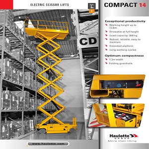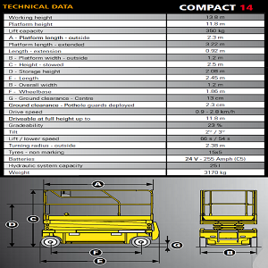 Thông tin sản phẩm COMPACT14 Chiều cao làm việc 13.8 m Chiều cao sàn 11.8 m Nhiên liệu Điện Acquy 4 x 6V, 220 A-h Trọng lượng máy 3175 kg Tải trọng nâng 350kg